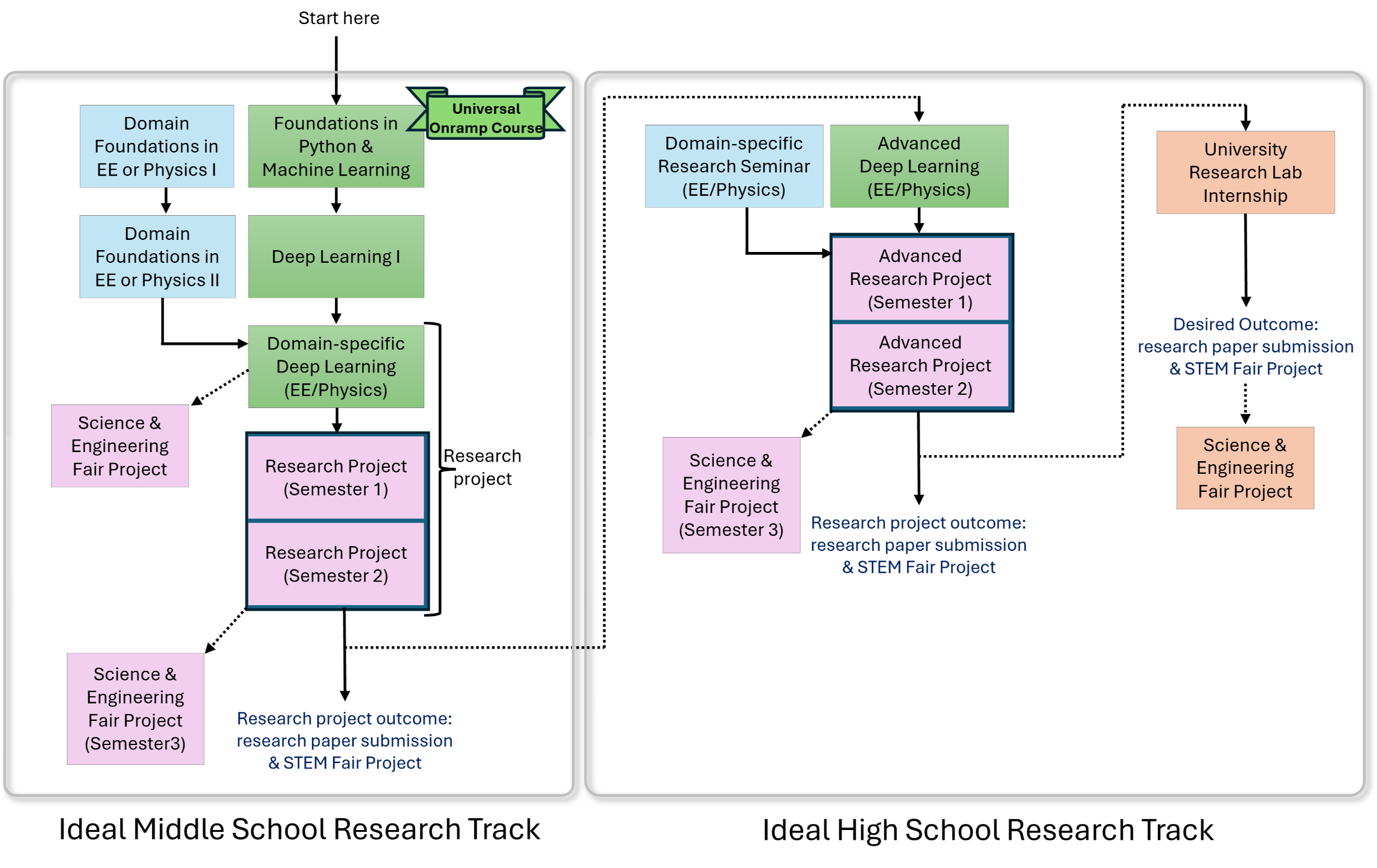 Our flexible curricula start with options for foundational courses in both programming & machine learning, and domain-specific course work, followed by research programs designed to lead to research paper publication and science fair competition project entries.